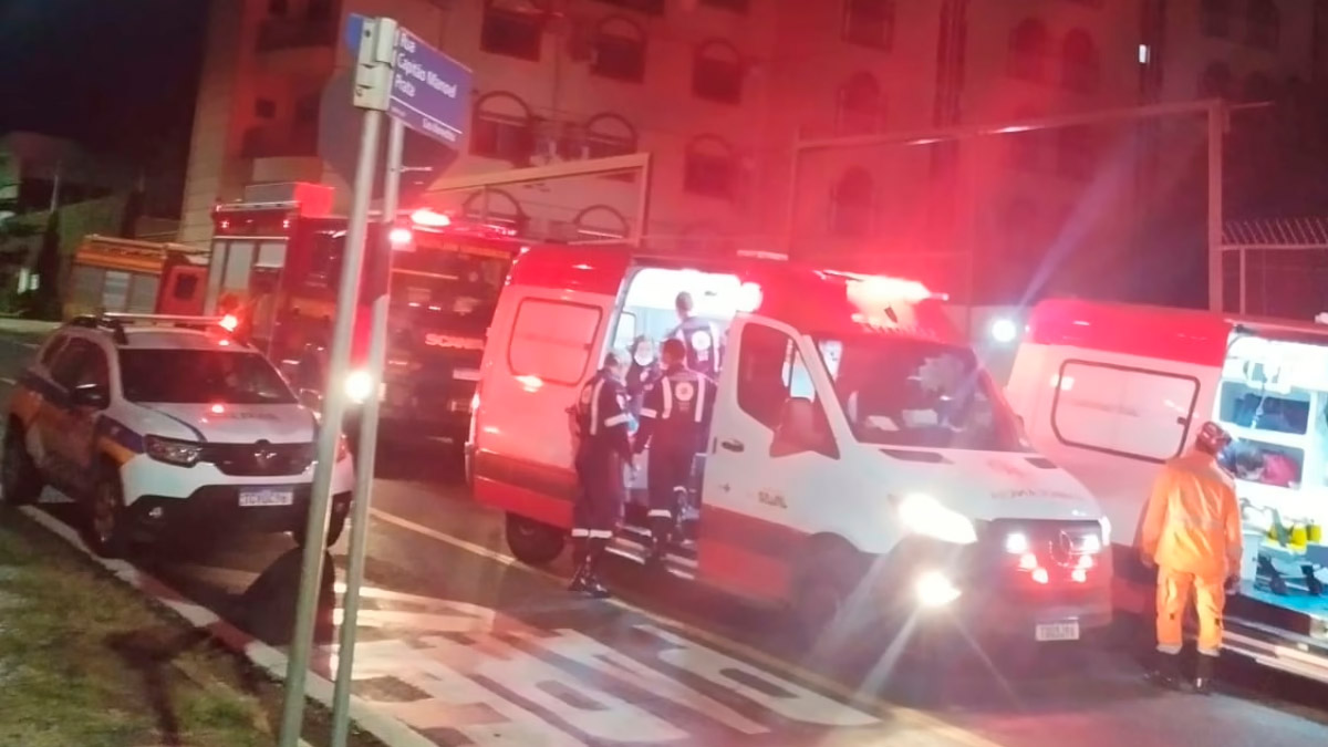 Bombeiros, Samu e PM mobilizam sete viaturas em socorro às vítimas de acidente em que carro atinge parede de hotel no centro – Crédito: CBMG/Divulgação