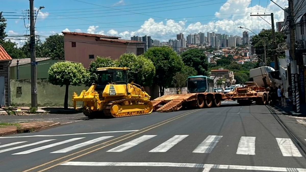 Um acidente envolvendo um caminhão prancha mobilizou equipes de trânsito e deixou moradores assustados no bairro Tubalina, em Uberlândia, no início da tarde desta terça-feira (25). O veículo, que transportava um trator de esteira recém-pintado, perdeu o controle na avenida Silvio Rugani e, infelizmente, atingiu um poste de iluminação pública, após não suportar o peso do maquinário.