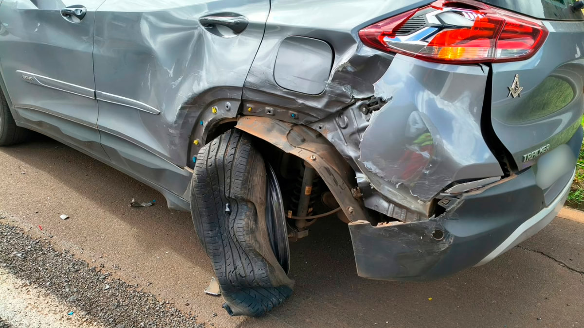 Traseira de um Chevrolet Tracker danificada após ser atingido por outro carro no acostamento da BR-050