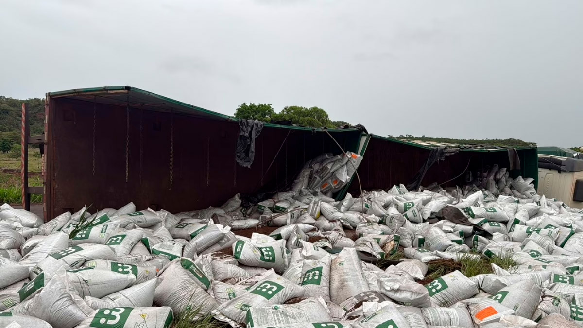 De acordo com a Polícia Militar Rodoviária (PMRv), o conjunto de veículos, formado por um caminhão Volvo FH 540 e dois semirreboques, transportava ração para peixes avaliada em aproximadamente R$ 64 mil. Parte do material ficou espalhada pela rodovia, o que levou à necessidade de sinalização para evitar novos acidentes.