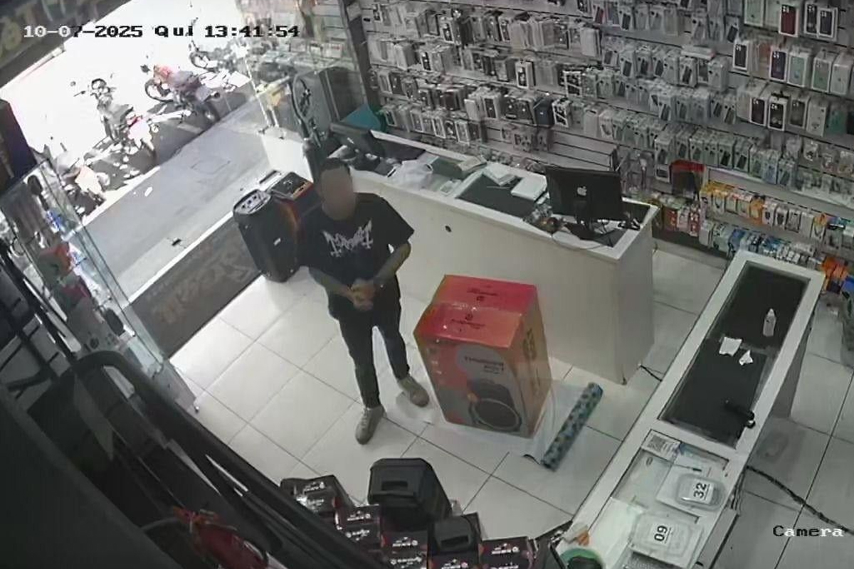 A prisão ocorreu imediatamente após mais um furto, desta vez em uma loja de assistência técnica na rua Coronel Antônio Alves Pereira. Imagens de câmeras de segurança flagraram o suspeito escondendo um celular em sua roupa enquanto saía de bicicleta.