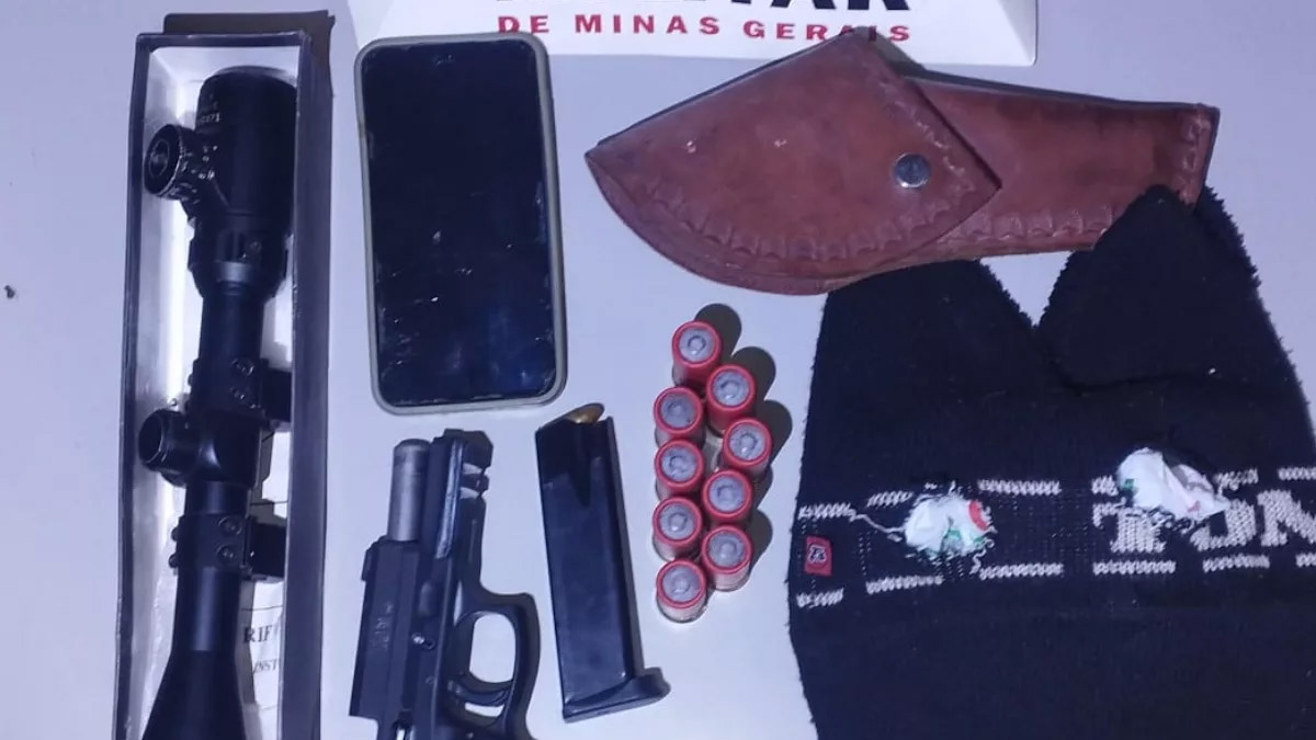 Durante as buscas na residência, os militares localizaram uma pistola calibre 9mm, sete munições do mesmo calibre, nove munições de calibre 12 e uma luneta. O suspeito, um homem de 34 anos, admitiu não possuir registro da arma e afirmou que a havia adquirido de um terceiro.