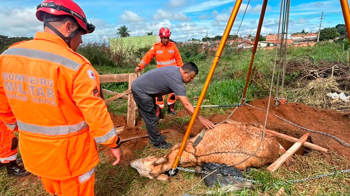 Animal ficou preso sem conseguir se mover, e retirada exigiu técnica de içamento com tripé, polias e trabalho de cinco militares durante cerca de uma hora.