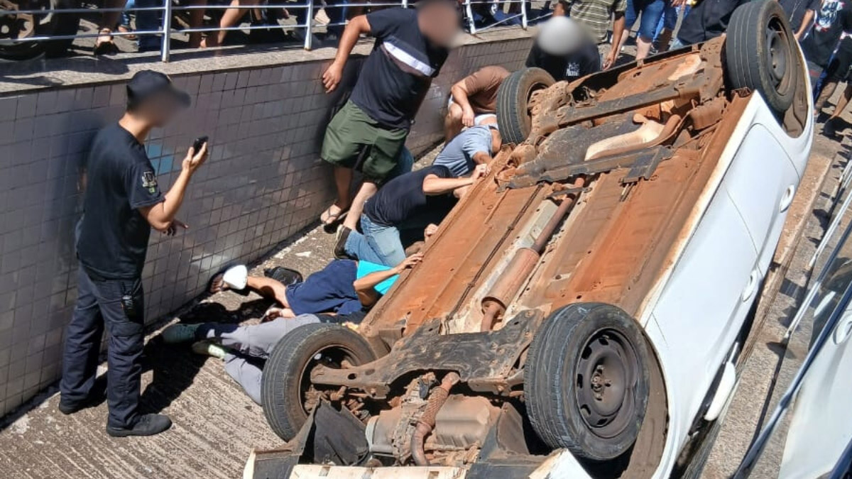 Segundo testemunhas, a motorista estava tentando acessar a parte inferior do estacionamento quando, infelizmente, perdeu o controle da direção e colidiu contra a lateral da rampa de acesso. Com o impacto, o carro capotou e acabou parando de ponta-cabeça.
