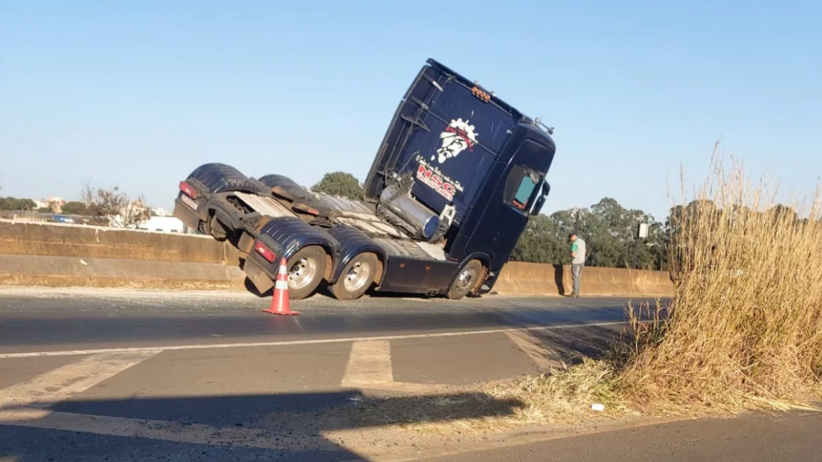 Na manhã desta segunda-feira (25), um cavalinho de caminhão subiu sobre uma mureta de concreto na BR-365, em Uberlândia. O incidente ocorreu quando o motorista tentou desviar repentinamente de cavalos que invadiram a pista.