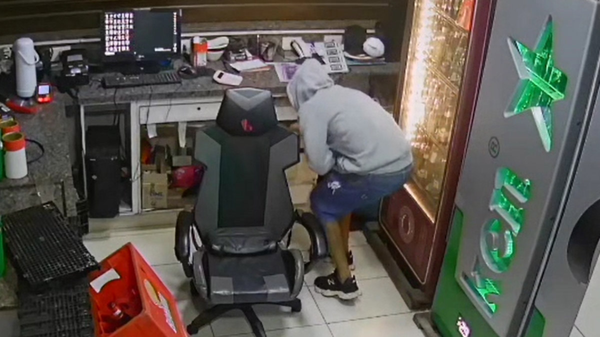 A invasão mais recente ocorreu na manhã do último domingo (6) e foi registrada pelas câmeras de segurança do bar. Conforme mostram as imagens, o suspeito — que já trabalhou no estabelecimento por alguns dias — age com extrema tranquilidade, aparentemente alheio ao movimento de pessoas na rua. Além disso, é possível observar o momento em que o homem pula a grade do bar e sai do local carregando uma sacola plástica. Em seguida, ele permanece agachado por um tempo nas proximidades. Por fim, ao deixar o local, outro homem aparece e parece questionar sua presença ali.