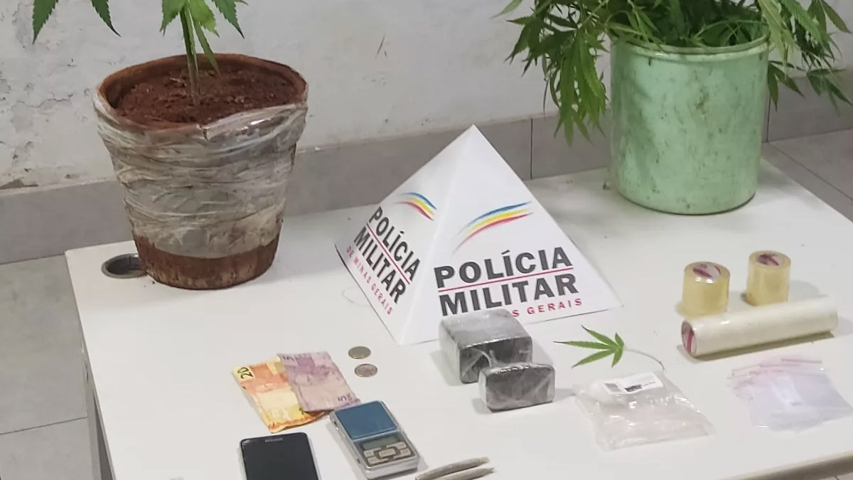 Com a permissão concedida, os policiais iniciaram as buscas dentro da casa e localizaram duas barras de maconha, uma porção de cocaína, uma balança de precisão, um celular e diversas embalagens utilizadas para o tráfico. Além disso, no quintal do imóvel, foram encontradas três mudas de maconha, evidenciando o cultivo da droga.