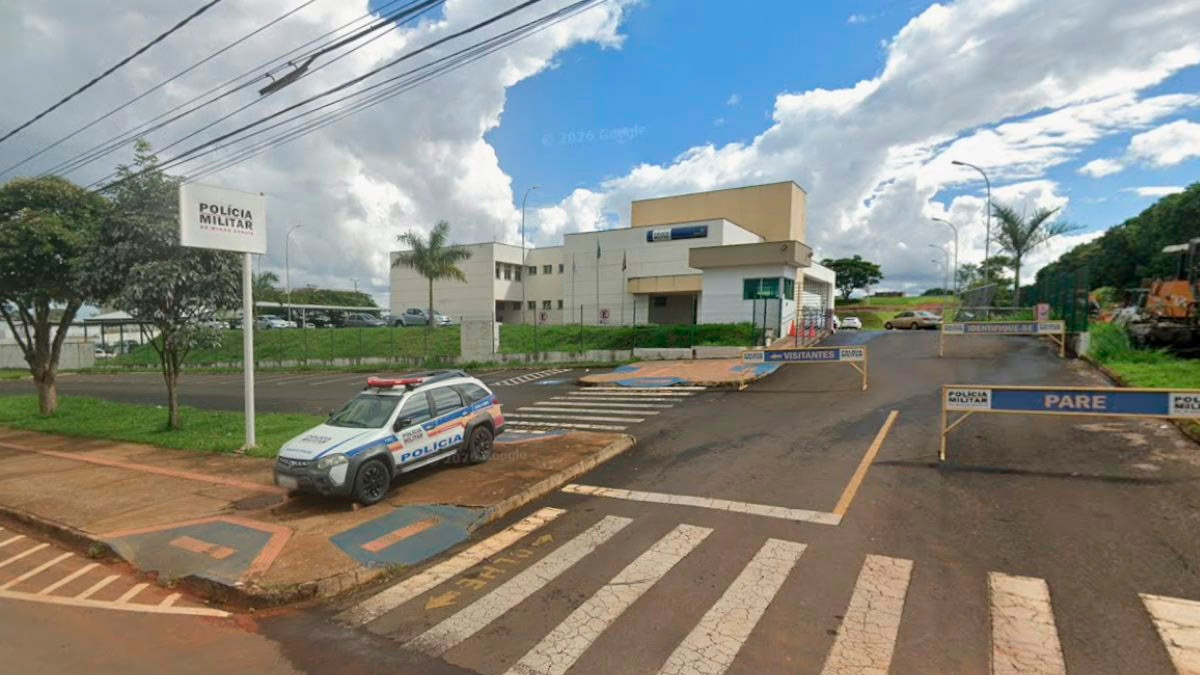 Fachada de uma delegacia de polícia com uma viatura da Polícia Militar de Minas Gerais estacionada