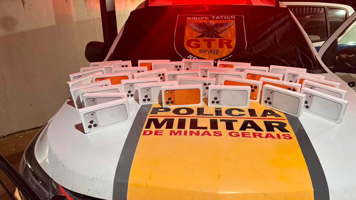 A Polícia Militar Rodoviária (PMRv) apreendeu uma carga avaliada em meio milhão de reais em celulares de luxo na madrugada desta terça-feira (25). A ação ocorreu na BR-153, no município de Comendador Gomes (MG). Ao todo, foram retidos 34 iPhones 17 Pro Max, que teriam vindo do Paraguai com destino a São Paulo. O esquema foi descoberto após os transportadores apresentarem uma nota fiscal suspeita e fornecerem informações contraditórias aos militares.