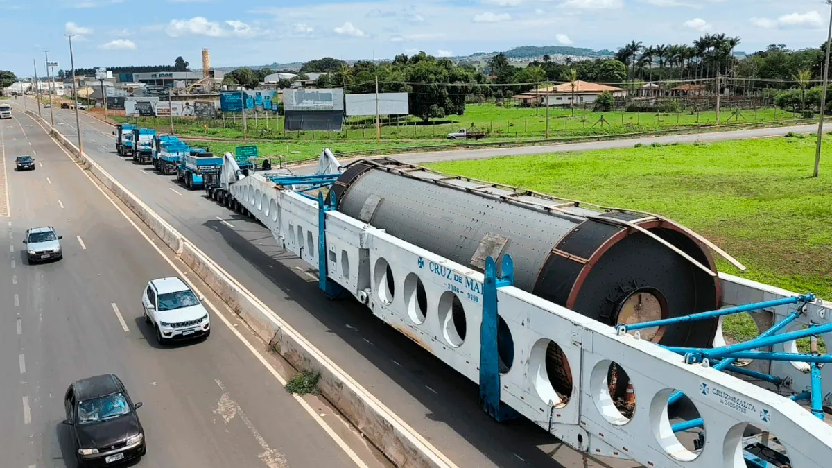 A peça transportada é um sistema industrial de moagem utilizado na trituração de cimento. Devido ao seu tamanho colossal, ela ocupa toda a pista e requer apoio constante de equipes da PRF, da Polícia Militar Rodoviária (PMRv) e de operadores logísticos especializados.