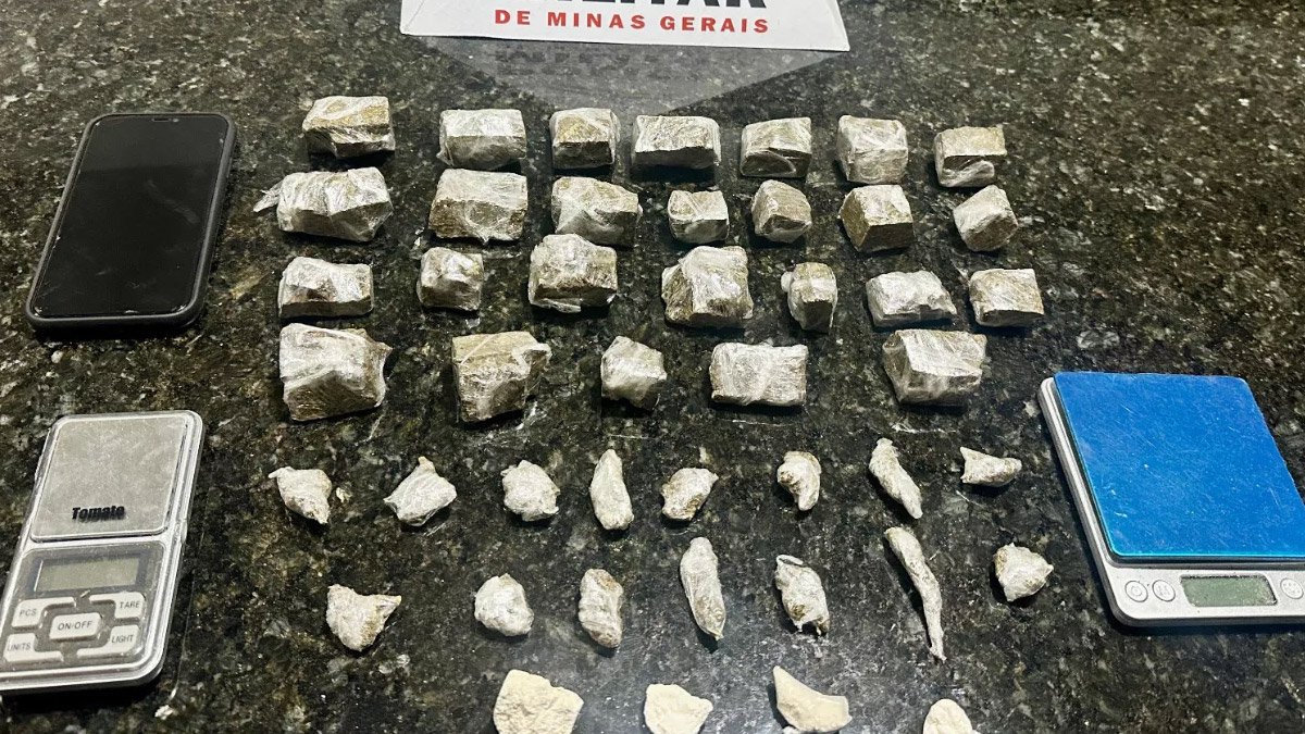 Durante a abordagem, a Polícia Militar encontrou com ele 26 tabletes de maconha, 15 buchas da mesma substância já preparadas para venda, além de duas pedras e dois papelotes de cocaína. Além disso, foram apreendidos dois celulares e duas balanças de precisão.