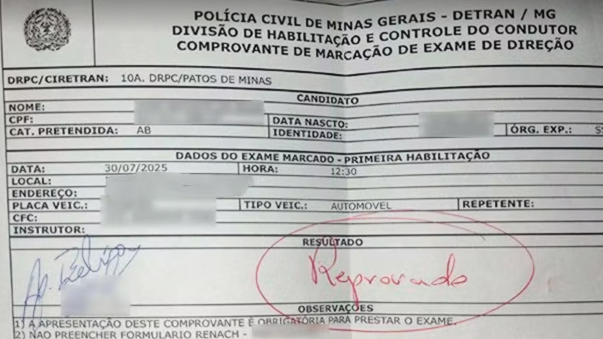 Nesta quarta-feira (30), um candidato de 52 anos foi detido em Patos de Minas após reagir de forma agressiva à reprovação no exame de direção, que é uma prova prática realizada pelo Detran/MG para avaliar a capacidade do candidato de conduzir um veículo. Segundo a Polícia Civil de Minas Gerais (PCMG), o homem foi levado à delegacia por desacato, resistência, calúnia e difamação contra os examinadores.